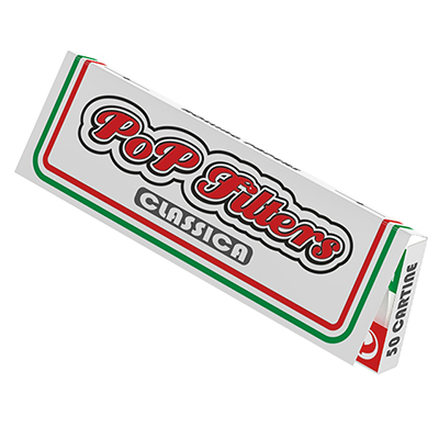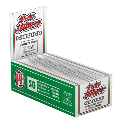 Papel PoP Filters Classica White Regular Size (37 x 70 mm). Librito de papel de liar de 50 hojas realizadas con papel blanco de 17,5 g/m² y pegamento Natural, clase A, Regular Burning (combustión normal). Producto de calidad superior. Ideal para ser utilizada tanto con filtros en cartoncito de 18 mm como con filtros en acetato de celulosa de diámetro 6 y 8 mm